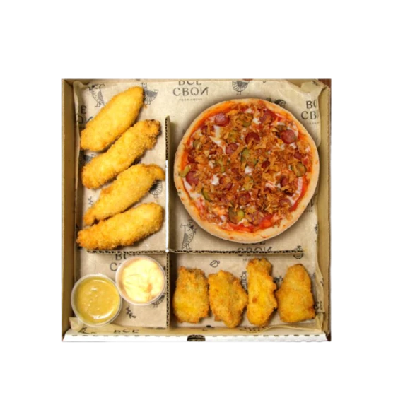 мини пицца Диабло + стрипсы + картофель панко + соус спайси + соус горчичный