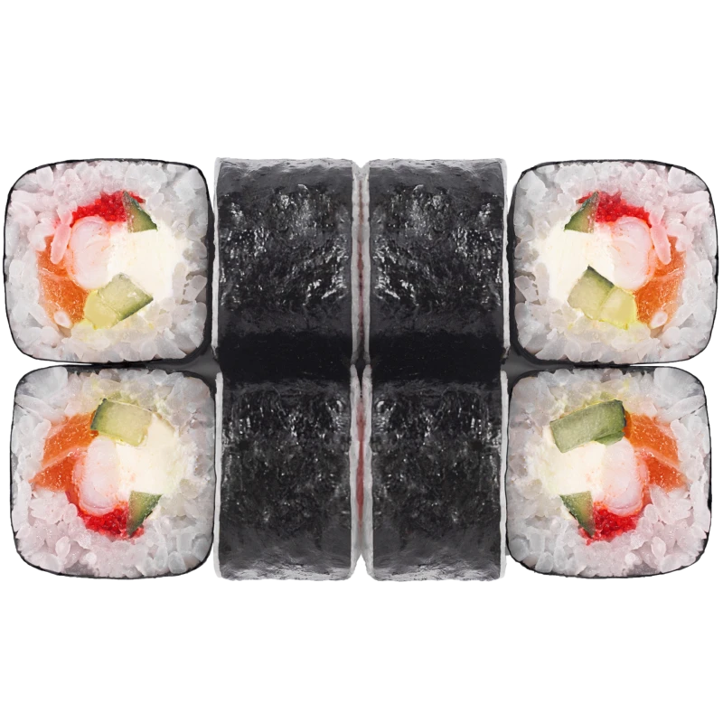 лосось, креветка, икра масаго, сыр творожный, огурец, нори, рис, васаби, имбирь, соевый соус