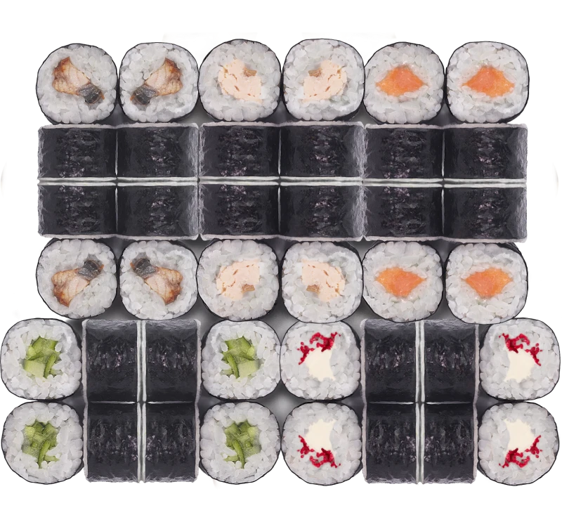 с лососем, с угрем, с копченой курицей, с огурцом, сливочный с икрой масаго, васаби, имбирь, соевый соус